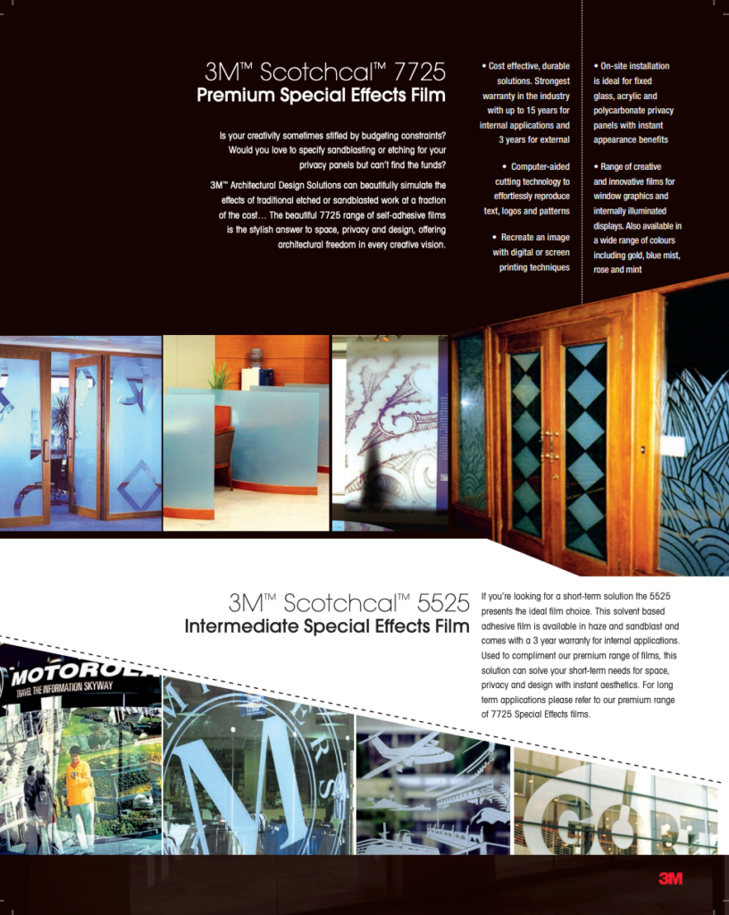 3M Fasara Films are made of thin, durable polyester with a decorative matte surface and are recommended for application to interior glass and the inside of exterior glass windows.